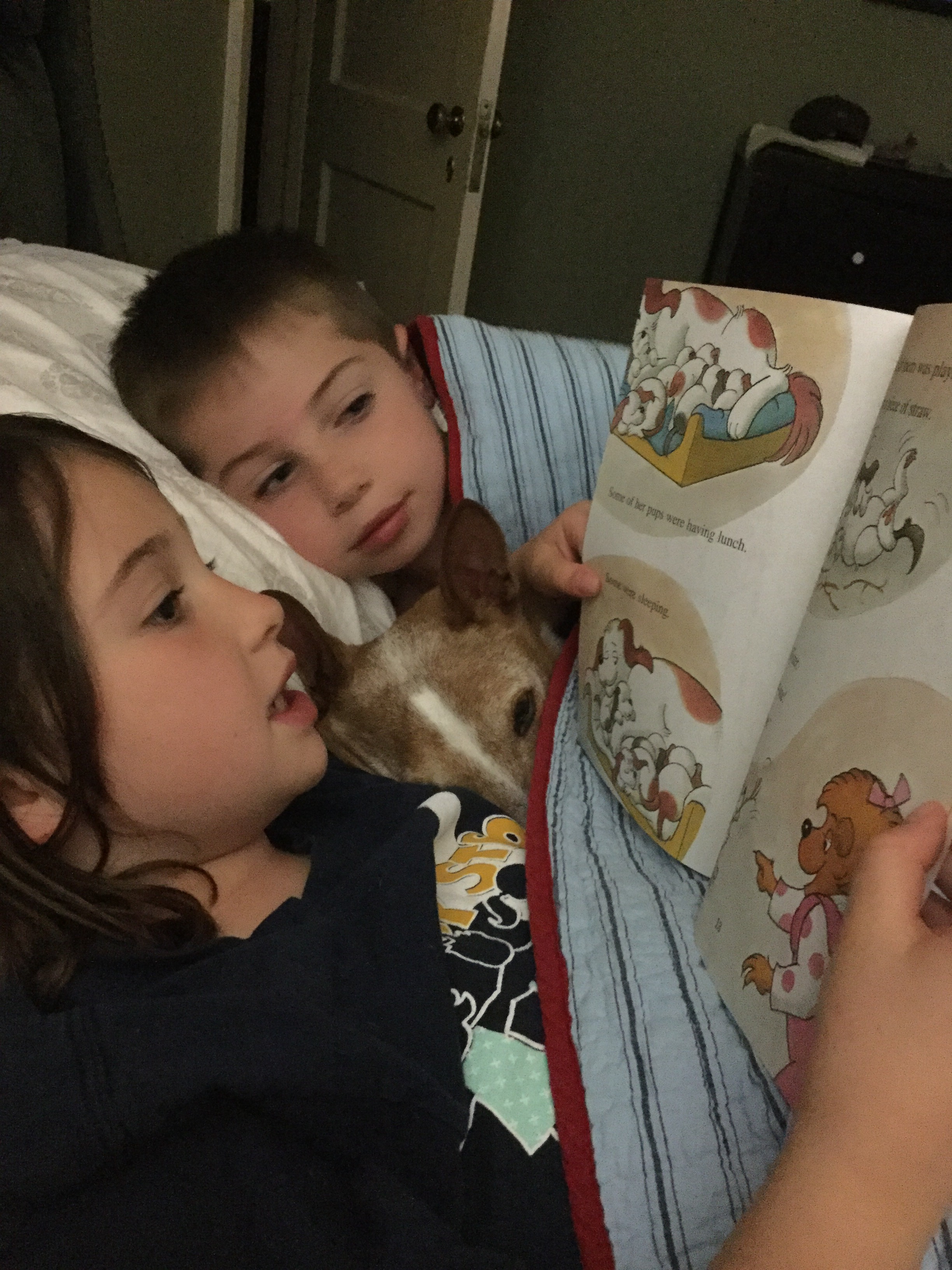 Testing my iPad app for updating posts. Here’s a picture of the sleepover the kids and I had when Greg went out of town. Logan was very happy squeezed between Trip and Taylor while Taylor read to us.