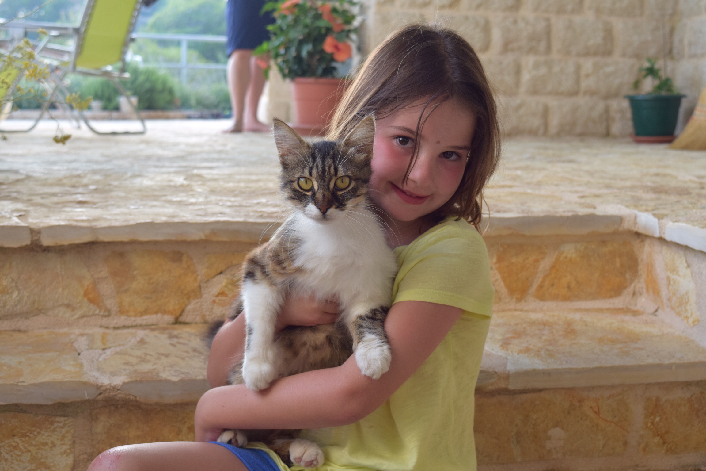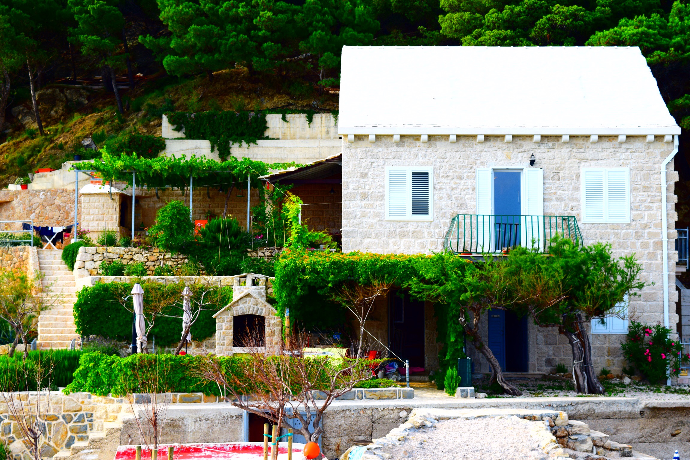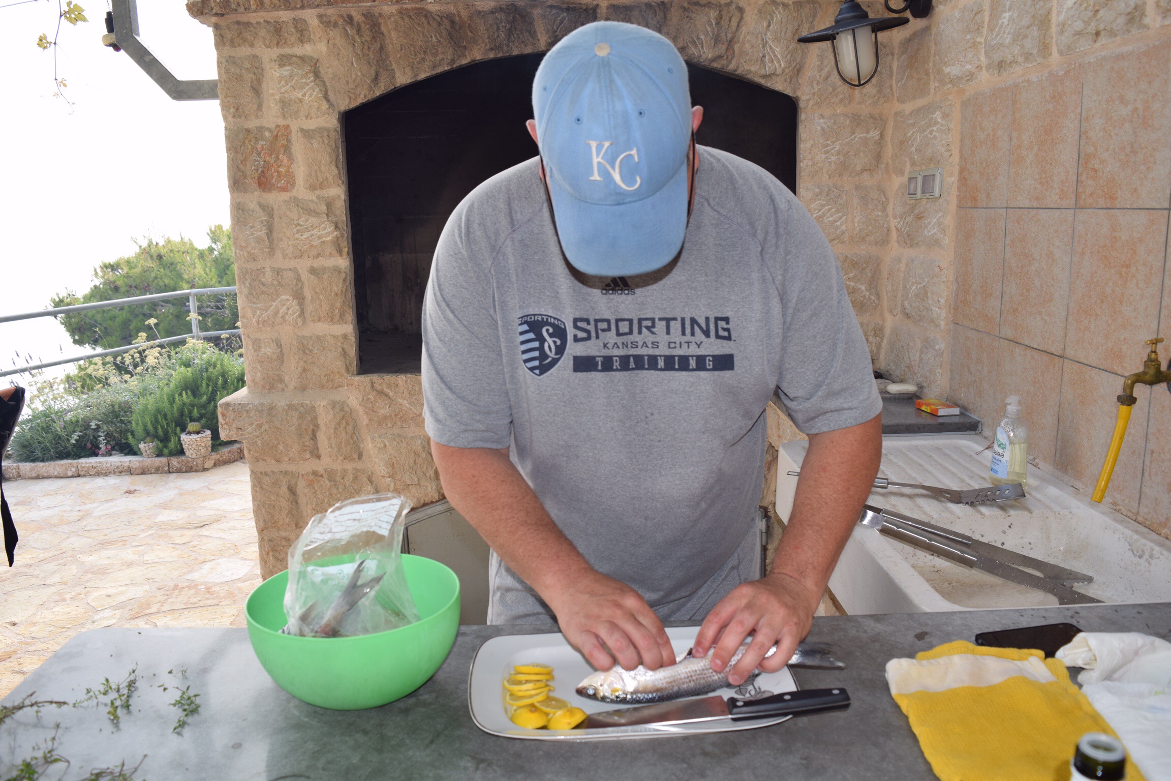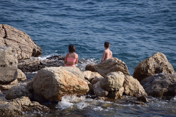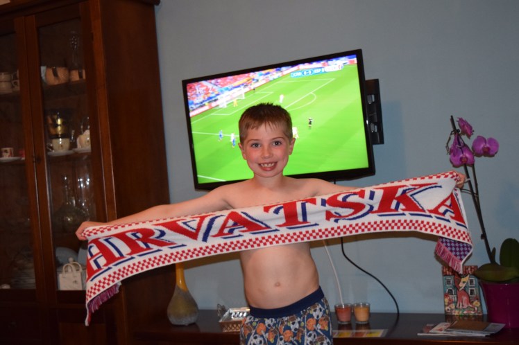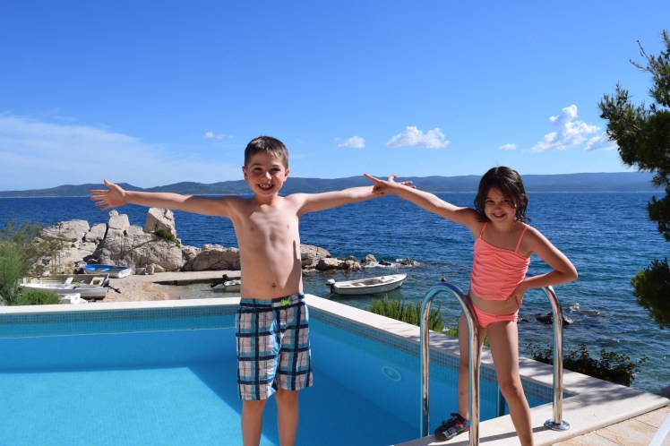 We left Dubrovnik for our beach house, about 4 hours north of where we were. We took the scenic route along the sea which was gorgeous but added a bit of time. The house is 200+ steps down, a 15 minute walk from any town and absolutely the most beautiful place I have ever seen. We all fell in love immediately. The next 5 days were spent swimming in the pristine turquoise water, snorkeling, boating in the little motor boat that comes with the place, swimming in the pool a few meters from the sea [yes I’m now speaking metric], eating, drinking, reading and relaxing. We got to watch Croatia (Hrvastka here) beat Spain and Greg did an amazing job using the grill to make all our dinners. The owners had plenty of their home grown wine waiting for us – their family has been making wine for 100 years – and brought us fresh fish they caught. If you know us at all, you will understand how surprised we were to be handed a bag of fish with the heads on them but Greg did a fantastic job cooking them up. It was the most delicious fish I’ve ever eaten. The kids are desperately missing our dog, but they adopted a cat here and named it Oscar. We bought it cat food, but he also got fish and a pork chop bone to nosh on.