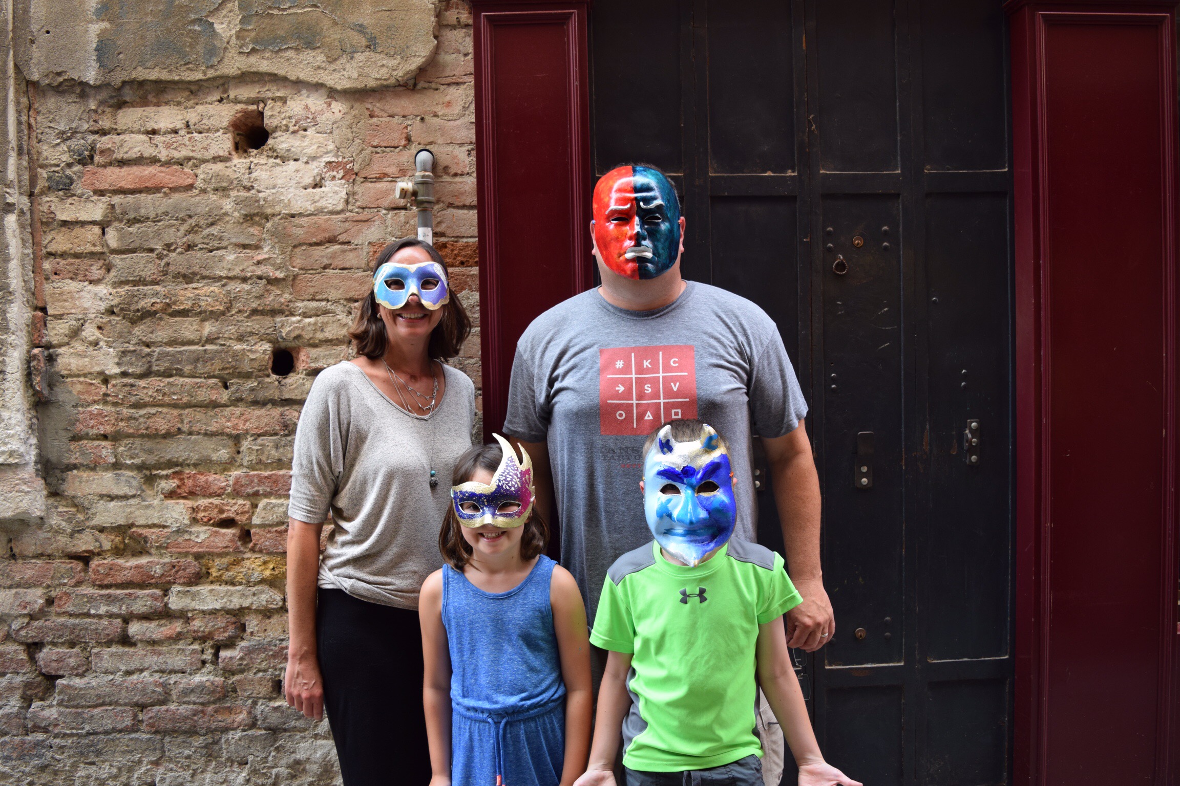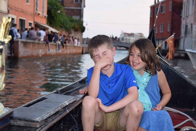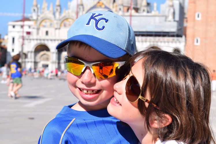 A ferry then took us to Venice.  We spent 2 days there and had not expected to like it as much as we did.  We had a blast there.  The kids spent HOURS chasing the pigeons in San Marco square while Greg and I watched as we drank cocktails.  We did the obligatory gondola ride which was actually fun and painted our own Ventian masks which was a blast.  Oh and we did lots of shopping (not necessarily BUYING because we of course have no room).