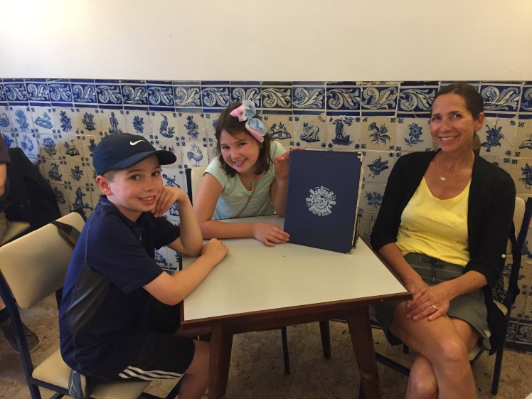 Our last day in Lisbon we spent in the historic Belém district. We tried to bicycle there but sadly (especially for Taylor), there were no kid sized bikes available. Belém is right on the river and is the home of Jerónimos Monastery, Belém Tower, the Monument to the Discoveries (dedicated to those who contributed to exploration), and many museums. It is also home to a famous and very very crowded pastry shop, Pasteis de Belém. Well worth the line to try a recipe that has remained unchanged since 1837. Because we were there at the end of the day, their pastry selection outside of the infamous Belém pastry was limited so the kids were unable to order anything they loved. That was ok though – they had some ice cream when we got back home.